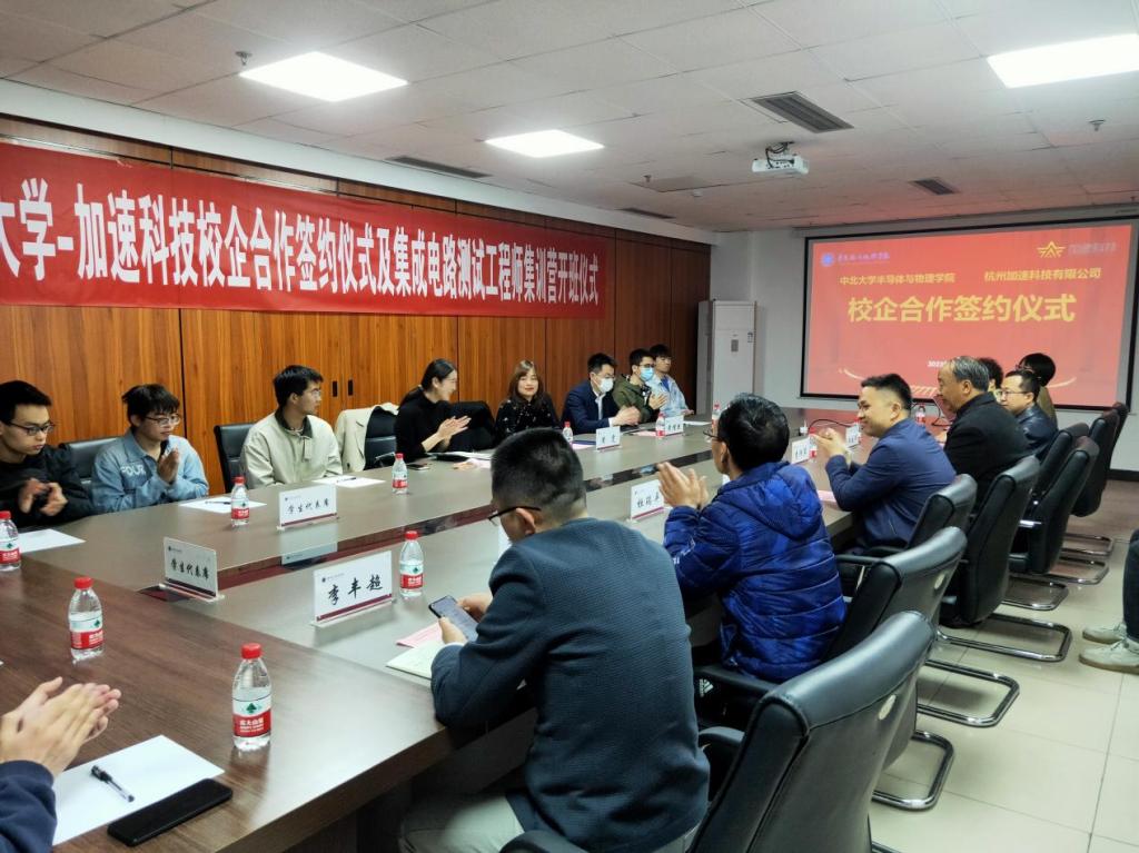 领导和学生代表介绍了加速科技有限公司的基本情况,她说,加速科技是一群来自农村的大学生创立的公司,怀揣着最朴实的报国梦,力争在未来5年内为半导体产业输送1万名半导体产业工程师,公司愿与香港六合彩官网