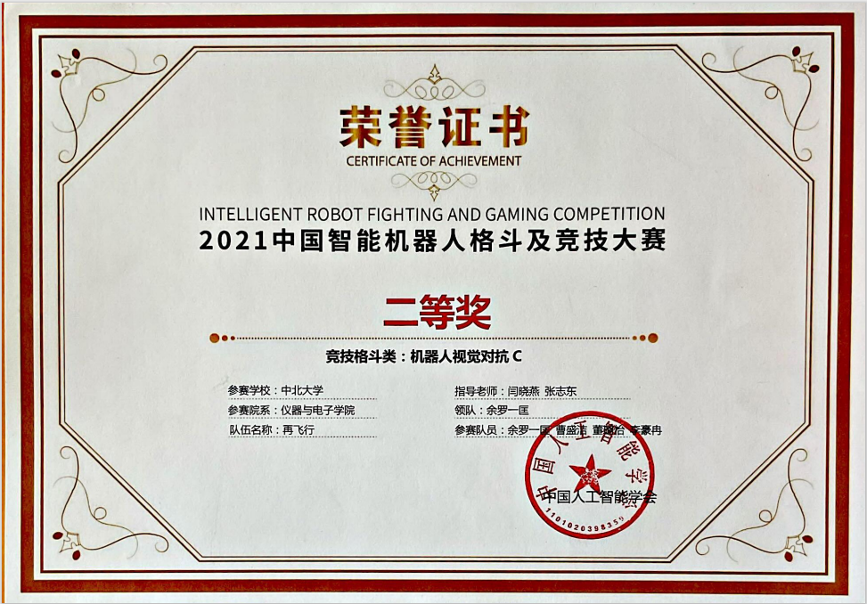 2021年,获中国智能机器人格斗及竞技大赛获“竞技格斗类:机器人视觉对抗C”项目组国家级二等奖。