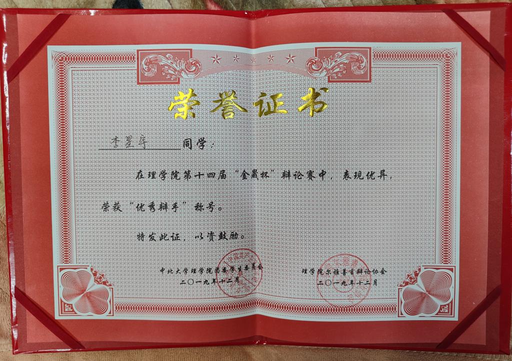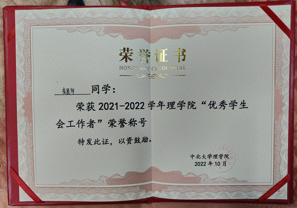 2019-2020学年获得获校级综合素质三等奖学金,2020-2022两学年获得校级综合素质二等奖学金,GPA 3.25,目前专业排名19/95,现已考至大连理工大学等离子体物理学专业。
