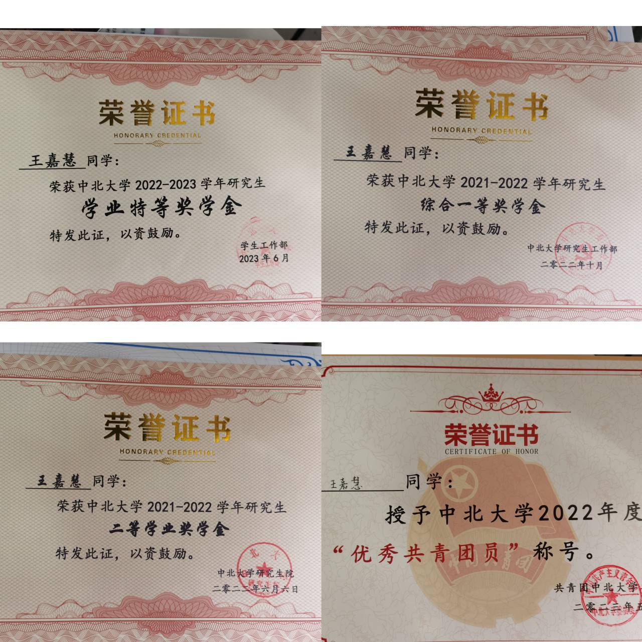 在思想上,在习近平新时代中国特色社会主义思想引导下,我始终在思想上、行动上与党中央保持高度一致、自觉贯彻执行党的路线方针政策,坚持党的基本路线,坚持党性原则,坚持政治立场,坚持理想信念,在2022年,获得中北大学2022年度“优秀共青团员”称号。