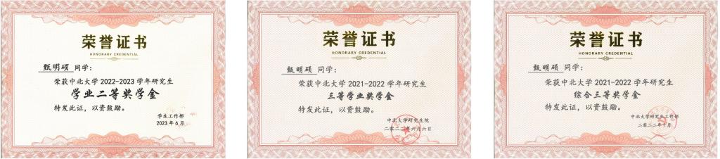 对于学习科研,我始终保持认真严谨的态度,努力学习专业知识,在专业名列前茅并通过英语四六级。获得2023年国家奖学金以及多次学业奖学金,综合素质奖学金。此外,我在研究生期间积极参加学术交流活动,严格遵循科学严谨的求学和研究态度,实事求是,认真钻研,不断提高科研能力,并在导师的指导下发表SCI论文三篇,另外还有一篇在投。