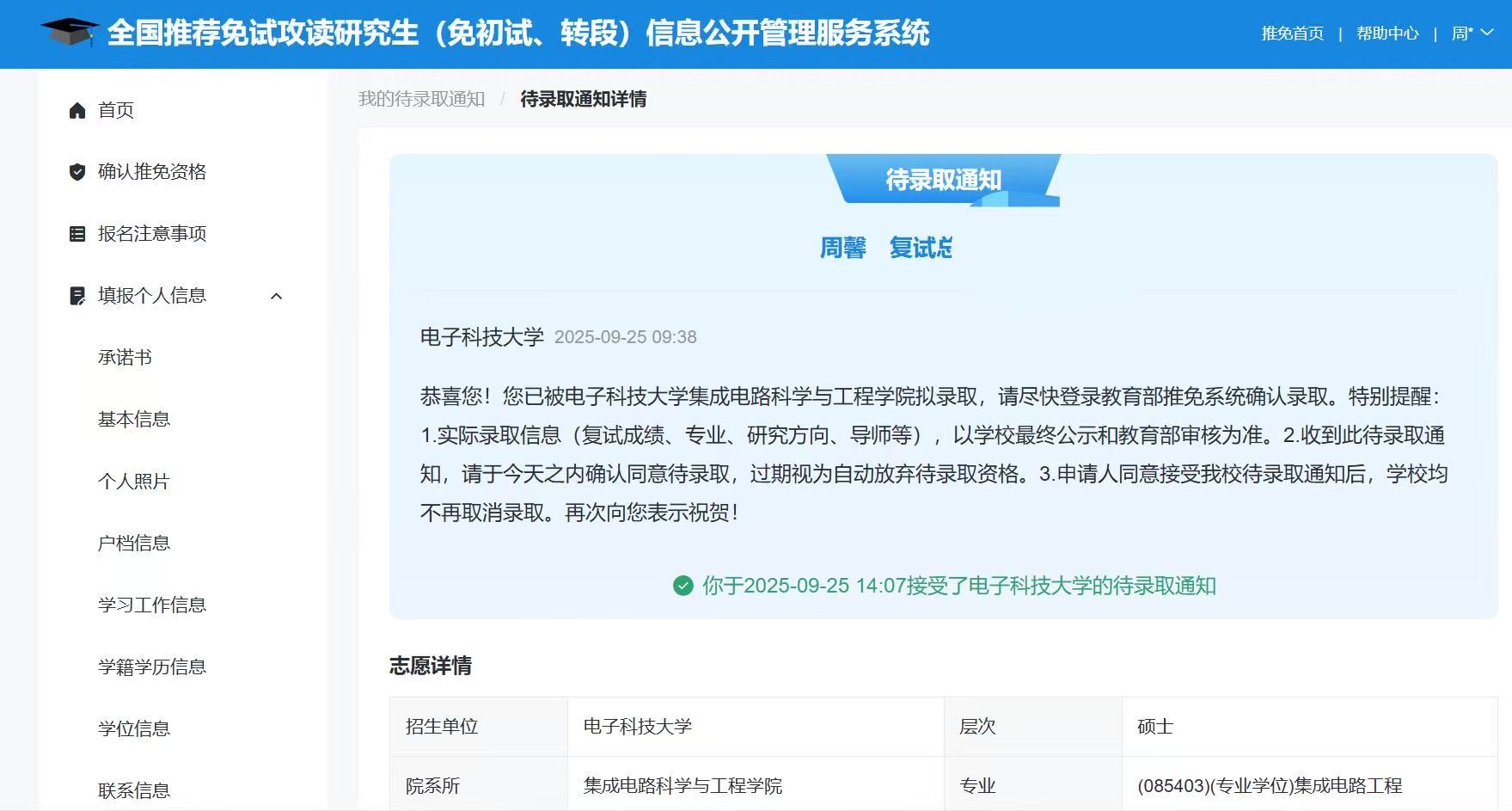 在推免夏令营期间,我在七月中旬参加电子科技大学的考核,顺利通过面试,学有所用,梦有所偿。此刻回望,从清晨图书馆的晨光到深夜照亮书本的微光,从学校实验室的钻研到面试现场的从容,保研路上的星光,是无数挑灯夜读的坚守点亮的,这份成果是过往耕耘的勋章,更是我学术科研新程的序章。大学生活是一场精彩的演出,大四,我想,我们将带着对母校深深的依恋,热爱生活,倒数着与中北大学的秋冬春夏,以最美的姿态谢幕。