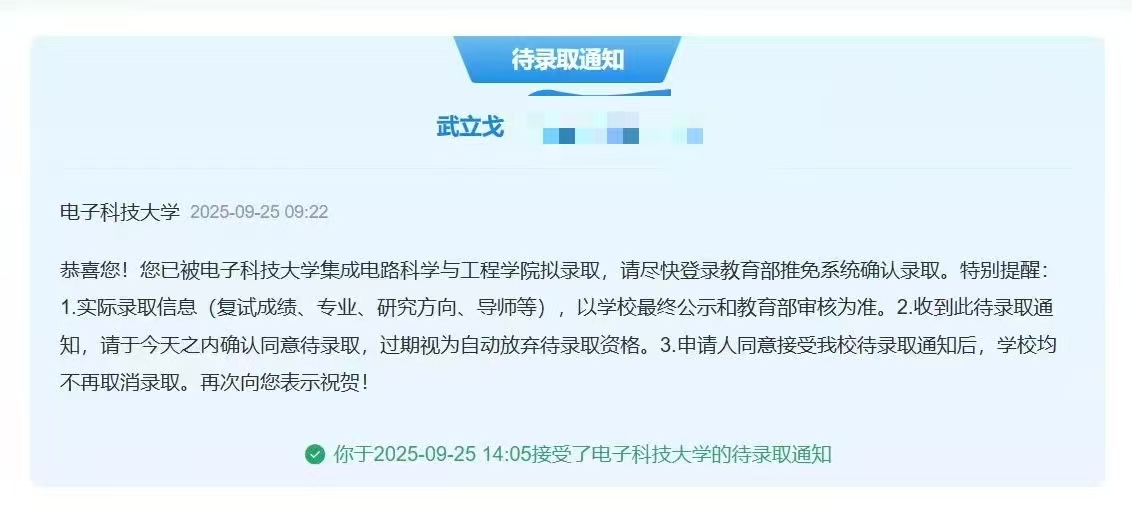 微电子所、北京航空航天大学、电子科技大学的面试,每一场面试都是一次自我审视与提升,我认真梳理专业知识、复盘竞赛经历,在与导师的交流中明晰方向。最终,我如愿拿到了电子科技大学的录取通知,为三年的逐梦之旅画上了圆满的句号。