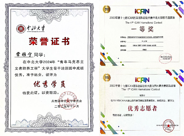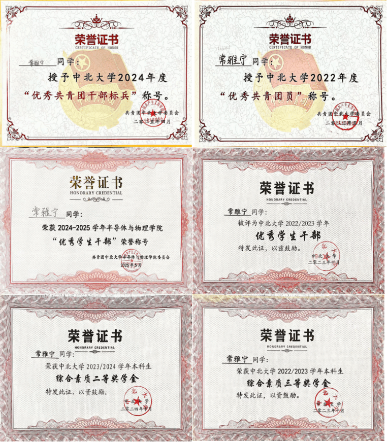 学生兼职团委副书记、微电子科学与工程党支部纪检委员、24190142班导员。平均学分绩点3.61,排名专业第九(9/149)。大学期间曾获中北大学“优秀学生干部”、中北大学“优秀共青团干部标兵”、中北大学“青年马克思主义者培养工程”大学生骨干培养班“优秀学员”等荣誉称号,曾获国家励志奖学金,综合素质一等奖学金等多项奖学金。