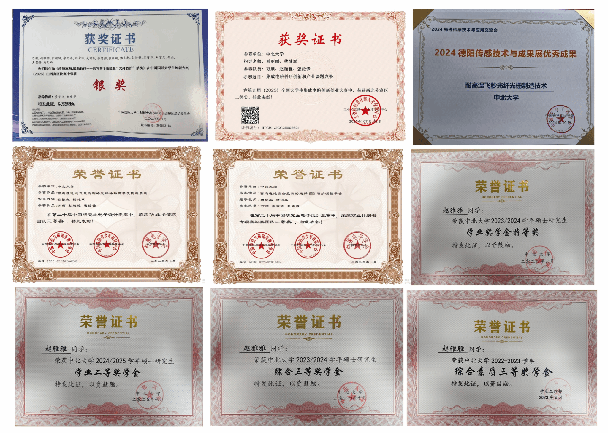 我始终相信,思想的边界决定成就的高度。因此我积极参加国际学术会议,在第十二届中国光纤传感大会、LMAM2025创新发展大会等学术会议上,我聆听着领域前沿的报告,与同行前辈们交流。这些经历让我跳出了自己课题的方寸之地,看见了学科的浩瀚全景,也让我研究的视野更加开阔。与此同时,我将科研中积累的知识与想法,带到“互联网+”、集成电路创新大赛、研究生电子设计竞赛等实战擂台。从技术攻坚到商业策划,与团队成员并肩备赛、熬夜调试、反复演练的经历,极大地锻炼了我的工程实践能力、团队协作精神和快速学习能力。这些经历也教会我如何将深度的专业思考,转化为具有创新性和竞争力的解决方案。