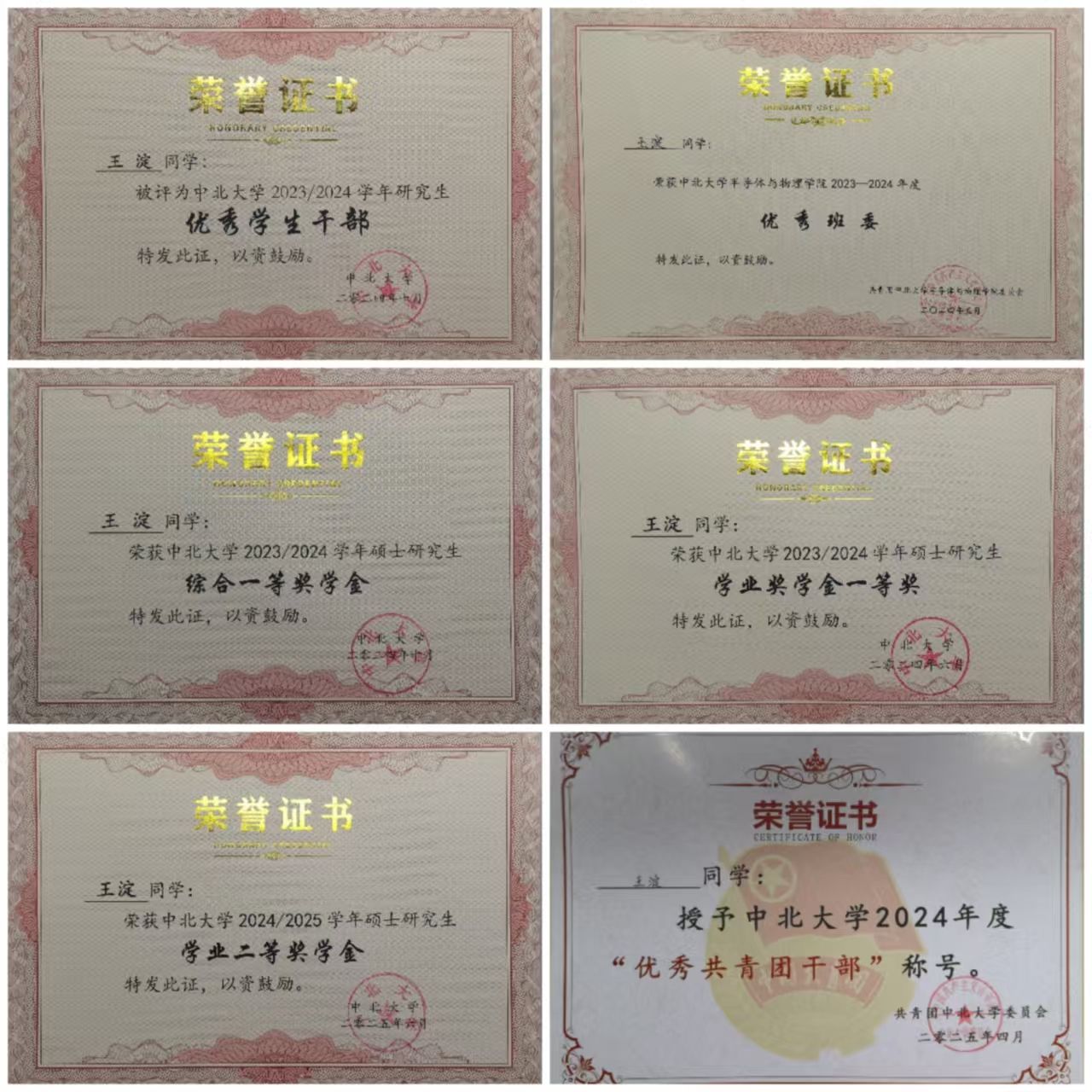 老师们和课题组师兄师姐们的无私帮助。我始终秉持“踏实治学、热忱服务” 的初心,在科研、学生工作与朋辈帮扶的多重赛道上稳步前行,先后斩获中北大学“优秀班委”“优秀学生干部”“优秀共青团干部” 等荣誉称号,以及学业奖学金一等奖、综合一等奖学金、国家奖学金等多项奖励。