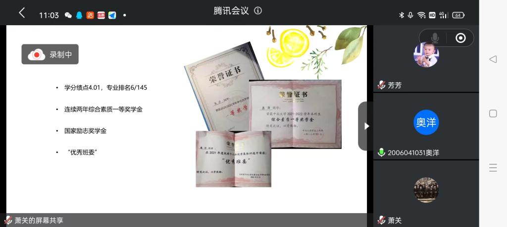 王齐乐同学从思想、学习、生活三方面分享了自己的获奖经历,有勤工俭学上岗经历,还有自己学习心得体会。她告诉我们在大学要尽力而为,勇于尝试,勇敢试错,以积极向上的心态,有效方法去学习。