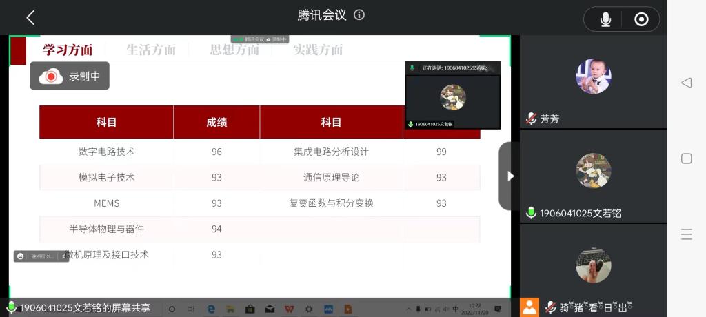 曾获“校园新冠疫情防疫优秀志愿者”荣誉的矦芳芳同学展示了自己大学生活期间做过的志愿活动,还传授同学们做志愿活动的方法,使大一新生更加了解志愿活动的内容。除了志愿活动,矦芳芳同学还从“自律能力,合理的时间安排,资源利用”三方面分享了自己的学习经验以此告诫同学们学习的重要性。