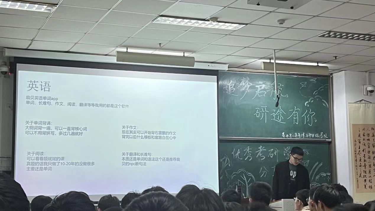 郝晋华学长建议大家要选择保护第一志愿的院校,不用过分看重自己的本科成绩,重要的是自始而终的坚持与耐心。同时,学长也从教材到APP软件等方面分享了自己的学习经验,并总结道:努力学习才能改变命运,相信自己必定可以成功,他也对跨考专业的学子们说:参加比赛少的同学们一定要在努力中提高自己的初试成绩,有目标,不盲目,祝大家一战成硕!