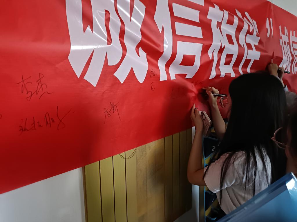 毕业生在横幅上签上自己的名字表示自己诚信的决心,也是一次毕业前的留念。这次毕业生诚信还款倡议签名活动让同学们坚定了诚信做人的品质,同时也促进同学们之间彼此的感情。红色横幅上一个个签名是学生们诚信品质的证明,也是学生的人格象征。