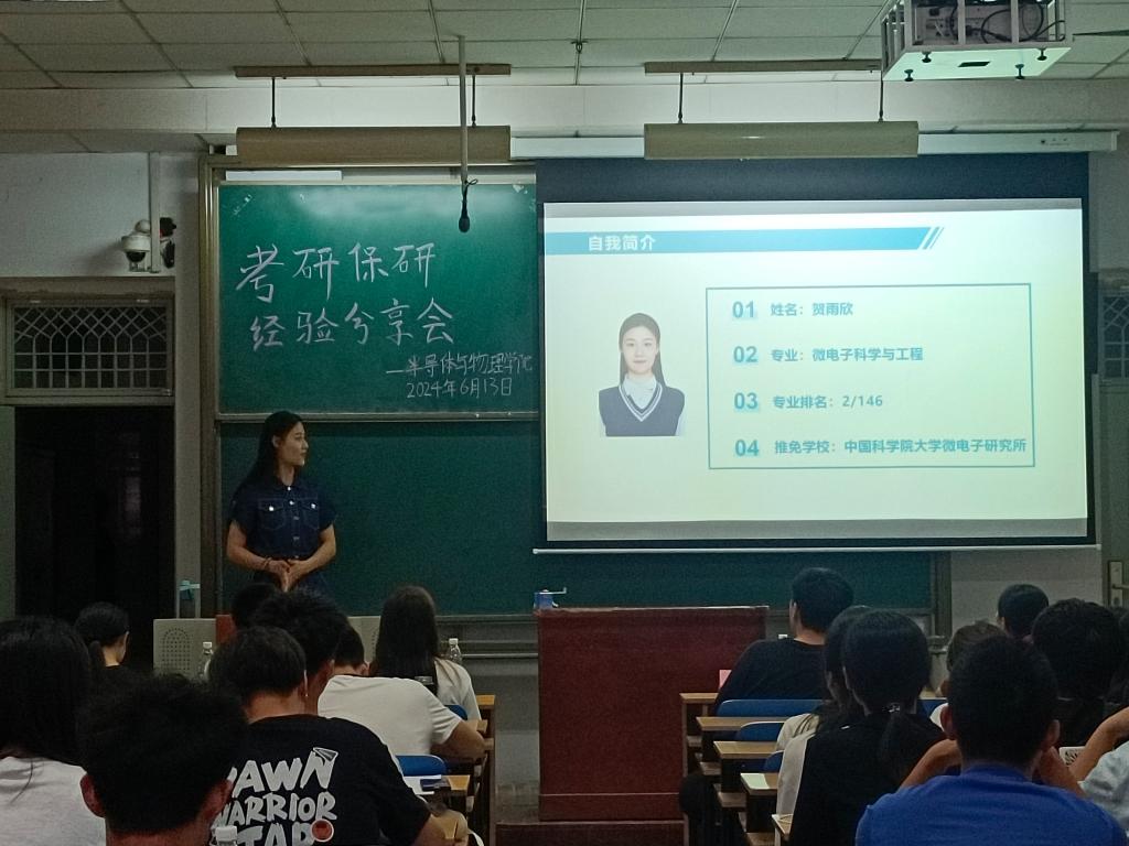 再下来向同学们分享的是敬金月学姐,她已经考研至西北工业大学光电工程信息专业。她认为,考研并非一蹴而就,而是需要长期的积累和准备。她说,考研想要一次性成功,就要心无杂念,一门心思认真学习,把所有的精力放在考研上。除了优异的成绩,综合素质的提升也同样重要。