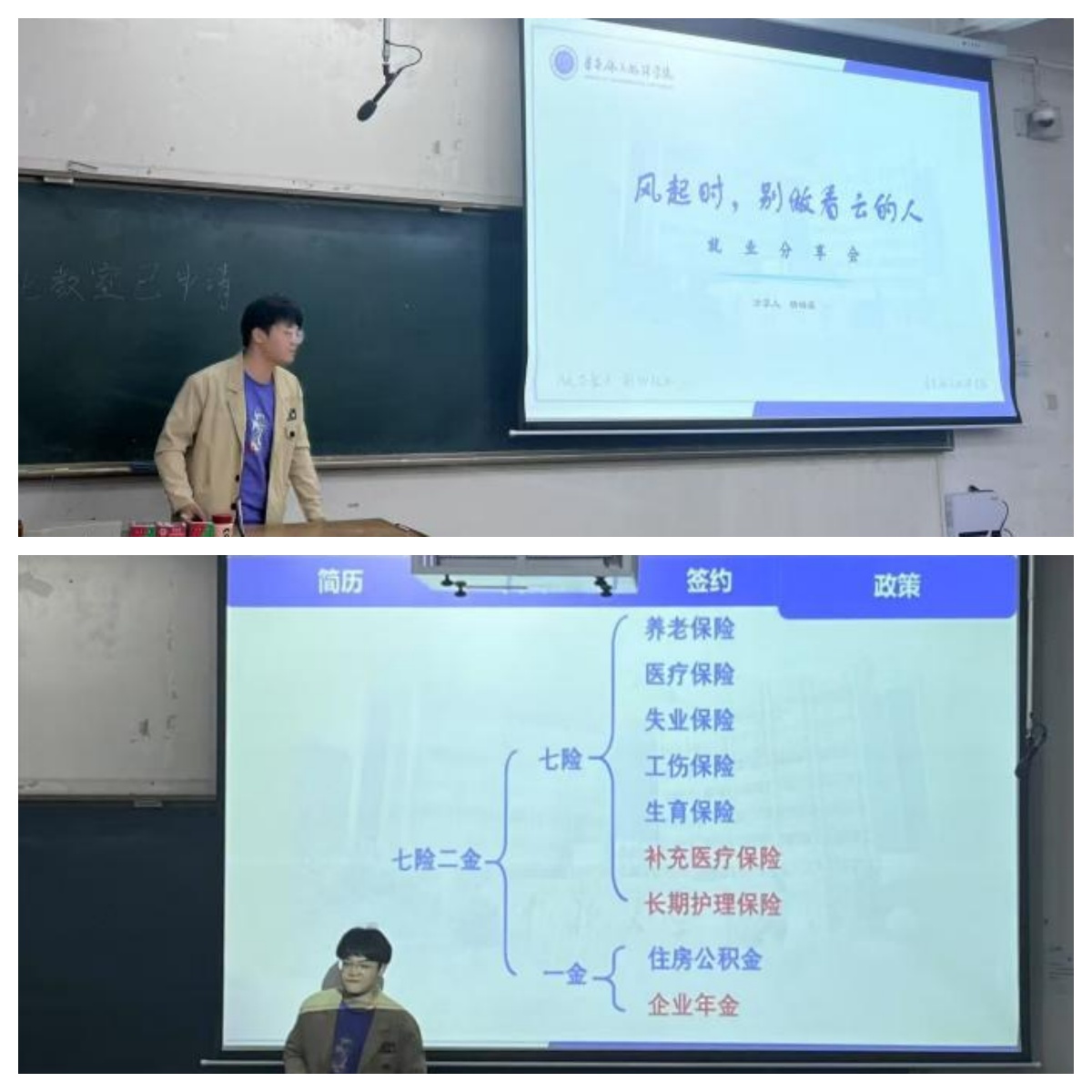 随后,王嘉和为同学们介绍了求职信息的获取及就业手续的办理流程。他鼓励同学们在春招中把握节奏,坚定信心,稳定求职心态。结合自身经历,王嘉和展示了求职和考研中的关键要点,鼓励同学们积极谋划求职路线,明确职业目标,不断提升综合能力,勇敢面对求职挑战。他以“青春是未写完的简历,每一笔都算数”为结尾,鼓励大一同学珍惜大学时光,过出精彩生活。